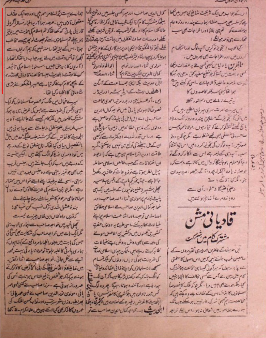 ص 167 ۔ قادیانی ہو یا لاہور ہم اسلام کے مشترکہ کام میں ہر جگہ قرآن کے حکم کے مطبق ان کے ساتھ کام کرنے کے لیے طیار ہیں ۔ ثناء اللہ