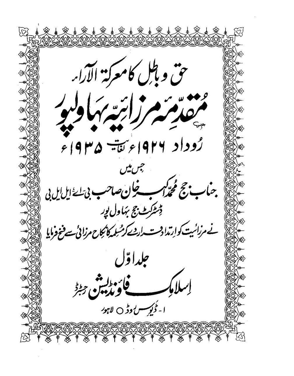 نبی کی اولاد کے لیے نبی ہونا ضروری نہیں ۔ مقدمہ مرزائی بہاوالپور